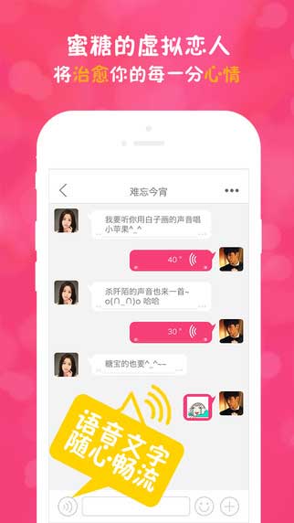 蜜糖是一款虚拟恋爱应用,为你24小时提供贴心的恋人服务,超多的萌妹子,暖男,在这里出售时间,治愈你的心情,氧气聊天,情感倾诉!
