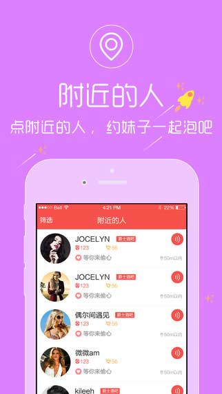 嗨秀是一个陌生人聊天交友的应用软件,专门为酒吧场景交互所打造,来一场酒吧偶遇,让约会就从身边开始,发现ta的心情,在这里尽情的展现你的个人魅力,俘获ta的心哟! 嗨秀app1.1特色: 1、发现志同道合和有共同语言的新朋友。 2、精准的定位酒吧的位置,帅哥美女一目了然。 3、一份神秘的礼物,来一场说嗨就还的约会吧。