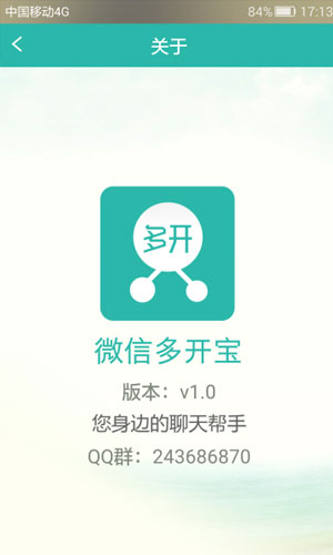 微信多开宝正式版 1.是一款能让您的手机同时使用两个微信账号的应用! 2.双微信号双待,不用切换,让微信更自由! 3.是你必不可少的应用!
