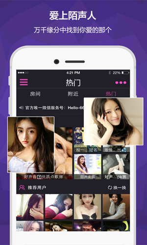 当你在茫茫人海中,希冀着遇到一个能听你诉说心事的知音,打开Hello,原来TA就在附近的灯火阑珊处。 当你还在认识新朋友时,请用声音打动别人,让别人认识你,认识自己, 跟新朋友说一句:“Hello!” Hello,只爱陌声人。深情久伴,不再匆匆而过...
