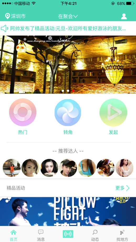 e转角app是一款既适用于陌生人也适用于趣味相投的熟人之间的交友软件,这款软件是本着场景社交和即时主局聚会的理念,可以发起主局和几个朋友或不认识的附近人一起享受不一样的周末,交更多的志同道合的朋友。这款软件可以发语音、文字消息、表情、图片,满足你想要交友、婚恋、休闲、学习等多种需求,打造专属你的社交圈。