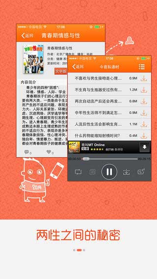 完美性生活app怎么样: 我们独家提供了男性健康、女性健康、今夜私语时、单身男女之夜等两性话题有声资源。通过这些有声资源,我们可以学到很多夫妻之间的那些事。并打造属于自己的完美性生活。我们所有资源都是高清资源,且支持离线下载,你可以下载到本地,离线收听。同时我们也提供了循环播放、随机播放等多种播放模式,还有很多其他的功能和细节等待你去发现!如果你有任何关于本APP的建议,都欢迎和我们联系。