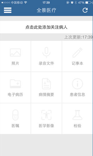 全景医疗app应用特色: 1.关注病人后,可查询病人的电子病历。 2.医嘱,检验单,检查报告,以及医学影像都能查看了哦。 3.可对医学影像进行序列播放,缩放,平移,调整窗宽窗位等基本操作。