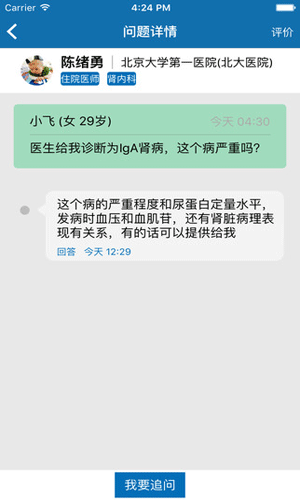 掌上肾医客户端特色: 1.一键快速问医生,随时随地想问就问,帮您找到合适的肾内科医生。 2.个性化的学习:聚合优质、前沿的肾友资讯,为您普及正确的医疗知识。 3.智能化的病情评估:上传化验结果,就能评估肾功能状况,尽早了解自己的病情。