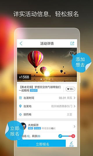 荡客app为喜欢户外运动的朋友搭建起一个交流的平台,你可以与其他热爱户外运动的朋友一起相约出发,体验充满刺激与惊险的户外运动。