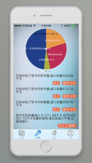 优加健身1.1特色: 1、详细的统计你的摄入的热量,并给出建议。 2、记录你的身体状况,数据与健康共享。 3、给你提出专业的晚间活动事项。