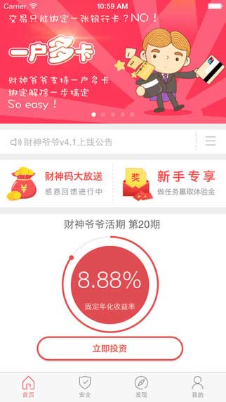 财神爷爷理财app4.1.1新功能: 1、财神爷爷超高固定年化活期收益8.88%。 2、全新支持一户多卡,绑定解除一步搞定。 3、一元起诉当天计息,闪电提现本息保障。