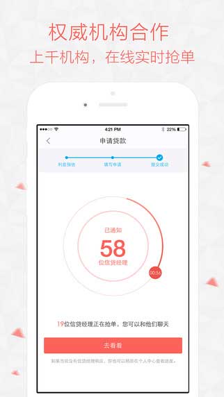 电兔贷款是一个互联网贷款的应用软件,入驻了全国上千家银行和贷款机构,每天都有信贷经理在线抢单,你只需要在这发布申请单,申请单会立即推送匹配的信贷经理帮你即时处理哦!