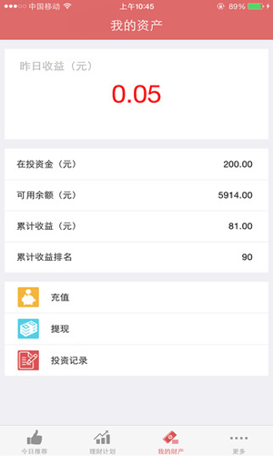 家财猫app可靠吗: 1.每日收益:精确您的每日收益情况,PK其他投资伙伴,感受赚钱乐。 2.今日推荐:每日精选一款最和您心意的优质标,助您轻松实现财富增值。 3.投资提现:手机轻松完成充值,投资。完整的提现流程,让您随时管理财务状况。