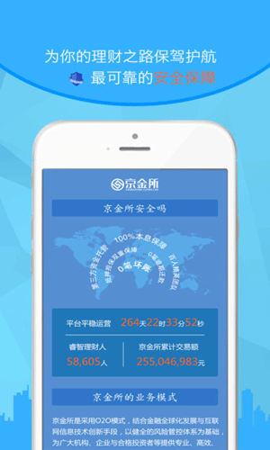 京金所app产品特点: 1、项目上线提醒:绝不错过每次投资机会 2、收益时时更新:准确把握资金使用效率 3、想投就去充值:支持多家银行快捷支付 4、操作简单快捷:一键登录抢占投资先机