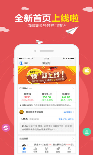 集金号手机版,一款专业的贵金属看盘软件,集金号手机版为用户提供免费的贵金属行情动态、最新财经资讯等,用户可通过集金号手机版,随时掌握最新市场行情,黄金白银投资快人一步!