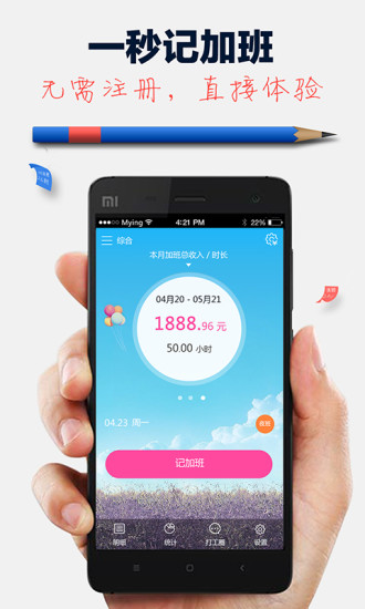 记加班帮你轻松的记录加班时间,详细的加班明细情况统计,帮你更加快速的算出加班工资,从此再也不必担心考勤出错。