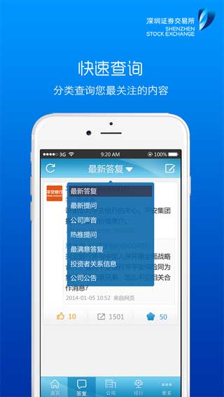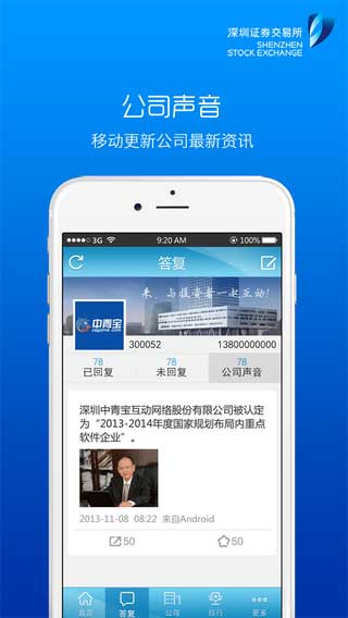 互动易公司端1.0.0特色: 1、分类答复,轻松查阅已回复,未回复。 2、公司声音发布,来自上市公司的一手资讯。 3、排行榜,上市公司,投资者的展示平台。