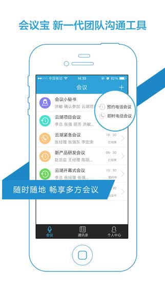 会议宝是一个移动的掌上会议服务的应用软件,让你的会议将不再受到地域场合的限制,随地随地地召开电话会议,实现了多人通话,提高工作效率,动动手指就能体验多人打电话的乐趣!