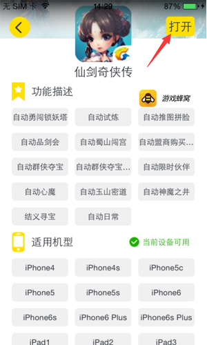1、安装好【游戏蜂窝仙剑奇侠传手游IOS版锁妖塔辅助脚本】,进入软件界面; 2、注册并登录游戏蜂窝,在“辅助库”页面中查找并进入“仙剑奇侠传手游”游戏专区,点击右上角的【打开】按钮并登陆游戏。 3、选择脚本并进行功能设置,设置完毕后【启动】脚本,游戏就随着之前设定的参数进行自动挂机的操作。