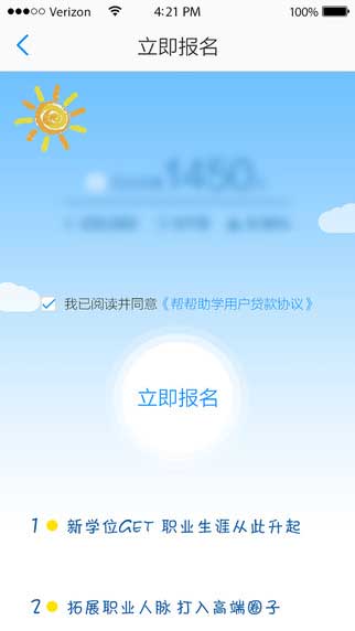 帮帮助学是一款面向教育领域的社交金融应用软件,专门关注于解决职场学员的上学资金问题,为职场人提供在职研究生,在职研修班,深造等学习项目提供分期缴费服务移动应用!