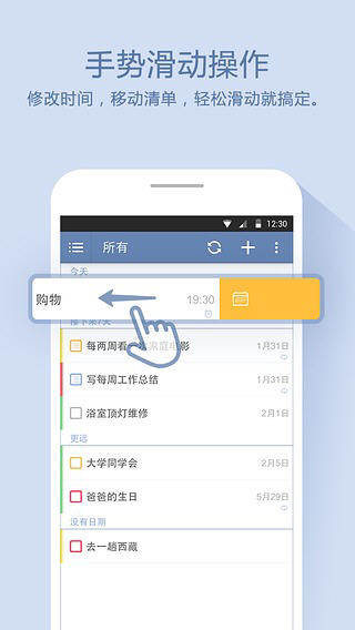 滴答清单,一款基于安卓平台的清单管理软件。简单方便的手势操作,功能强大的笔记管理功能,轻松罗列一天的行程安排。创新的跨平台协作,与好友一起,共同完成清单任务。 滴答清单软件特色 -清单任务分类管理 -时刻记录当天行程安排 -跨平台多人同步管理 -简单的手势操作 -重要事情设置提醒 -第三方平台账号登录 滴答清单1.5.0版本更新内容 1.【新增】用户新手指导页; 2.【优化】桌面插件显示; 3.【优化】界面显示及用户体验; 4.【修复】上一版本出现的bug。