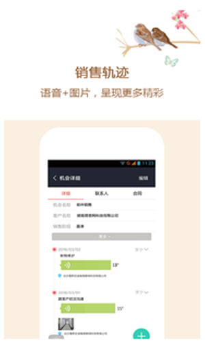 爱尚理客手机版功能特色: 1、爱尚理客手机版,让在外的销售人员享受外勤签到功能,记录外勤地点与时间,实现可视化。 2、一键扫描名片,更快是将联系人记录到您的手机之中,更加高端大气上档次。 3、销售过程完全跟踪记录,用文字、语音、图片的方式展现,让工作轨迹更加清晰,方便查看。