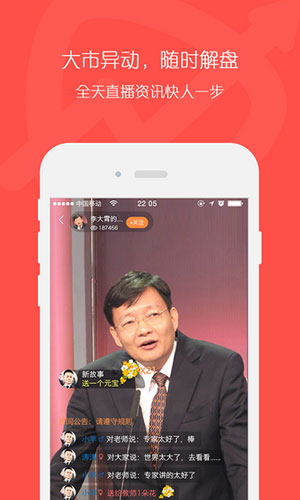 k线直播间软件特色: 1.在k线直播间,用户可以实现零距离接触财经明星,真实福利哦。 2.k线直播间让你与财经名家面对面交流,告别看不懂的投顾内参,k线直播间让财经投资随时发生互动。 3.k线直播间还有百名专家实时在线,有问必答;买入卖出不再纠结,实盘盘中解答股民持仓问题,免费诊断股票,让实盘操作更加轻松自如。