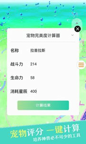 2、宠物评分,IV计算器 全新IV计算器功能,输入宠物的名称、CP值、HP值和升级消耗的星辰即可算出宠物的完美度,是玩家培养神兽必不可少的工具。