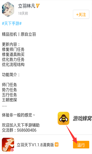 游戏蜂窝天下手游挂机辅助工具辅助使用说明: 1、安装好【游戏蜂窝天下手游辅助工具】,进入蜂窝界面; 2、注册并登录蜂窝,在【发现】页中搜索“天下”; 3、选择好某个作者制作的辅助; 4、点击右下角的【运行】,设置好弹出的辅助功能,点【保存】; 5、进入游戏后,点击悬浮窗的小蜂窝,并点击【启动】即可运行辅助。