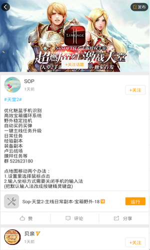【游戏蜂窝天堂2手游自动刷金币辅助脚本使用说明】 1、安装好【游戏蜂窝天堂2手游自动刷金币辅助脚本】,进入蜂窝界面; 2、注册并登录蜂窝,进入【首页】或者点击【前往辅助库】,搜索“天堂2”; 3、选择好某个作者制作的辅助; 4、点击右下角的【运行】,设置好弹出的辅助功能,点【保存】; 5、进入游戏后,点击悬浮窗的小蜂窝,并点击【启动】即可运行辅助。