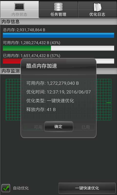 内存加速器会通过及时更新图表显示手机的总内存,以及现有可用内存和已用内存。
