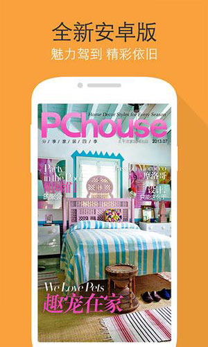 PChouse家居杂志特色 1.提供四季最美最时尚的家居生活,倡导时尚家居生活 2.制作精美,图文并茂,所有产品均附有高清图片 3.每月定期举办活动,送出大礼包 4.操作简单,滑动手指就可了解时下最流行家居产品