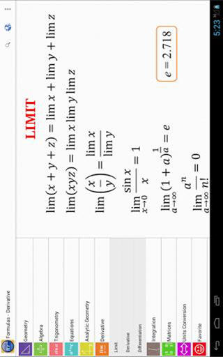 数学公式MathsFormulas,针对数学爱好者和学生党,我们为你提供了最全的数学公式大全。不论是微积分,还是三角函数,任何复杂的方程式,到这儿,都能变得简简单单,就跟纯净水似的。 数学公式MathsFormulas软件特色 -提供导数、积分、代数、函数等公式 -遇到不会的公式,点击查询修改 -将一切复杂的公式,转变成简单的运算 -分享至邮件、短信及其他社交网络平台