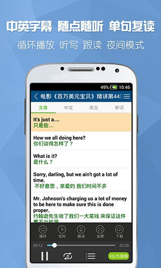 可可英语,一款免费练习英语听力及口语的手机软件。汇聚雅思、TED、欧美原声电影、BBC、英语歌曲等优质精品内容,并提供一键离线下载,让你走哪儿都能听。 可可英语2.5.1版本更新内容 1.【新增】定时关闭的功能; 2.【新增】离线下载位置选择; 3.【新增】全新栏目,英语电台; 4.【新增】排序功能; 5.【优化】循环次数设置; 6.【优化】订阅功能。