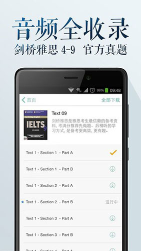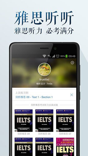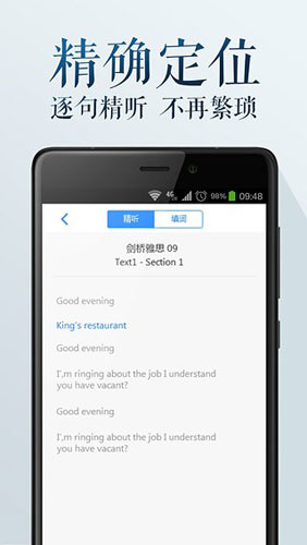 雅思听听app介绍 1.精选大量雅思听力材料 2.提供重点难点精细讲习 3.阅读原文提供逐字逐句的解析 4.针对用户水平提供针对性训练