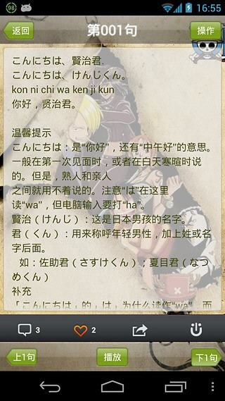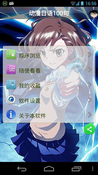 动漫日语100句,为你收录了来自动漫中最常用的100句经典台词,且每一句均是动漫原声配音,在脑海中迅速闪过主人公说这句话时的表情及动作,有没有很鸡冻、热血啊!漫迷万岁!! 动漫日语100句软件特色 -提供动漫中最常用的100台词 -动漫原声配音,更带感 -提供海量动漫精美壁纸 -有效提高你的日语口语