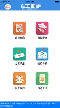 四川省教育考试院考生助手软件特色: 便——查询成绩查询录取手机端即可完成; 详——院校动态以及招生信息第一时间推送; 参——详细的院校介绍为你选择院校和专业提供参考;