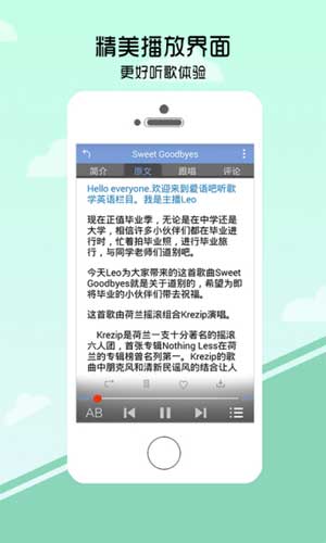 听歌学英语是一款好用的学习软件,它可以让你欢快的学习英语,为了让大家牢记英语单词,开发出了这一软件。让大家在听歌的同时,更有效并且更熟练的记住英语单词。这样以来可以全面的提升英语听力,来广泛它的词汇量。
