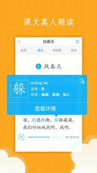是一款能让家长和孩子一起完成语文练习的应用,它能支持全国的课文朗读,和听写,能让你在家长的带领下完成语文作业,还可以提高你的语文写作水平。语文100分是2015年家长还有孩子最受欢迎的。所有版本的教学应用在这里都可以找到例如:人教版、北师版、苏教版等。
