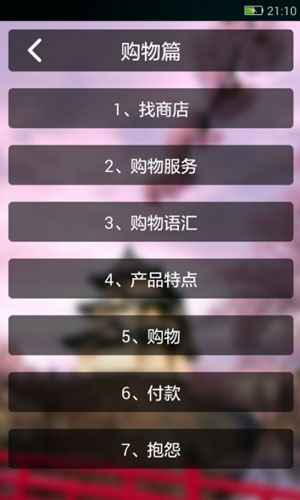 日语口语学习app应用特色: 1.包含1000多个常用和流行的短语句子,是日语入门学习和口语学习的理想工具。 2.涵盖日常交流、交通、住宿、就餐、购物、旅游观光等多个应用场景。 3.最关键的是!安装包超级小哦!省流量才是妥妥的!