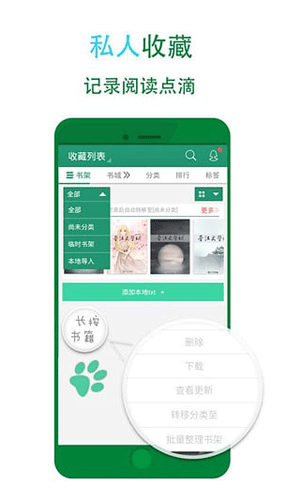 4.书架功能:平铺、书架两种展示形式,可让您随时将感兴趣的作品放入其中,并设置分类方便查找,同时具备单本作品的更新和下载提醒等功能;