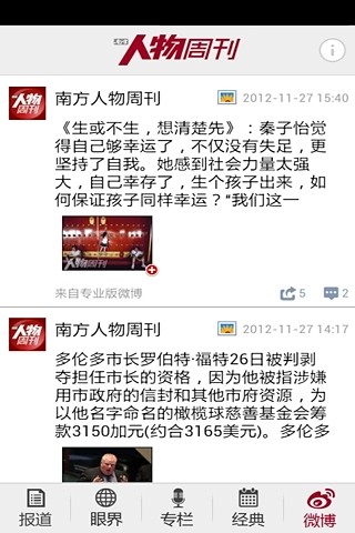 南方人物周刊电子版软件特色: 最新人物故事报道; 世界焦点图文资讯; 人物专栏深入解读; 关注微博最新热点;