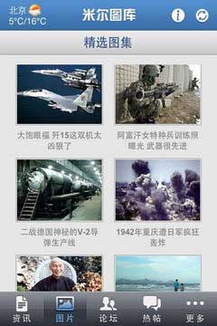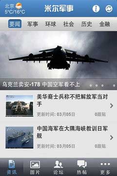 米尔军事2.2.3软件介绍: 1、可以更快捷的为你提供有关军事的新闻。 2、还可以为用户提供安全的军事资讯。 3、能把最新的军事新闻给你分享,让你成为独家。