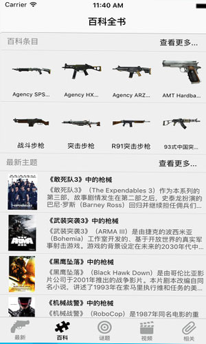 趣联枪械安卓版: 1.趣联枪械是最专业的枪械数据库,手枪、步枪、发射器等类型应有尽有。 2.用户可以在趣联枪械查看到相关器械的枪械规格、型号、性能、描述、图片、视频。 3.趣联枪械提供各类枪械出现的电影、游戏和周边产品信息,汇集成内容丰富的武器百科全书。