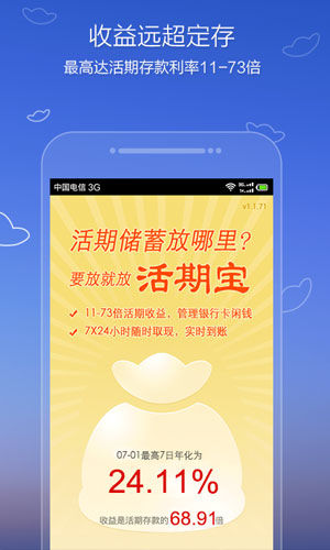 活期宝软件特点: 1、0风险、安全性高。 2、活期利率高到7%。 3、挂钩产品选择性强。
