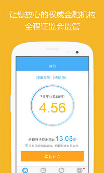理财专家功能亮点 1、手机理财,纵享金钱收益; 2、安全可靠,最权威的理财平台; 3、便捷支付提现服务,随用随取; 4、一键快速操作,轻松赚取财富。
