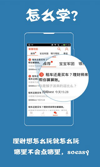 蛋蛋理财,一款专为理财而生的手机软件。致力于让用户体验快乐的理财方案,且时刻监控你所投资的理财产品。最新动态,一键通知。专业图表分析指导,每日年化收益看得到。 蛋蛋理财软件特色 -专家为你选择适合你的理财产品 -设置一键提醒功能,时刻查看数据 -收益图标直观显示,赚钱看得到 -采用账号模拟技术,安全账号无风险 蛋蛋理财2.4.0版本更新内容 1.【优化】登录异常的问题; 2.【优化】回复出错的问题; 3.【修复】头像加载出错的bug。