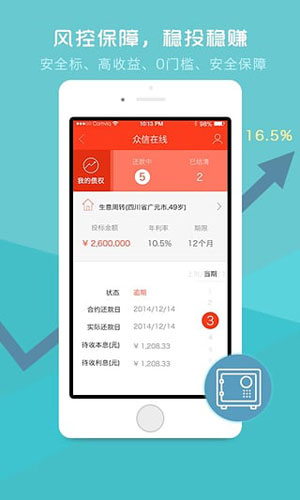 众信宝app是一款掌上理财手机应用,针对投资人提供多样安全的投资产品,治理不仅能够提供风险保障,还能够管理你的账户,自动投标,功能强大!