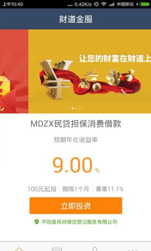 财道金服app是一款你十分便利的手机软件。财道金服app为温州财道互联网金融信息服务股份有限公司旗下互联网金融信息服务平台。财道金服app是在当地人民政府金融办公室的支持下,由民间借贷中心为主发起。
