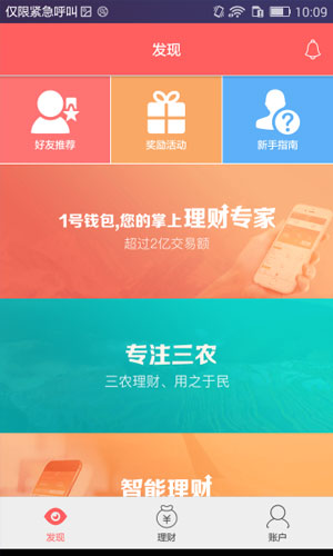 1号钱包app应用特色: 1.1号钱包是新型的掌上理财工具。 2.理财,选择合适理财产品进行投资获得收益。 3.奖励活动,参与活动获取额外收益。 4.发现,快速了解所有重要功能方便操作。 5.账户,进行个人资料设置、查询所有交易动态等。 6.分享好友,邀请好友一起来使用。