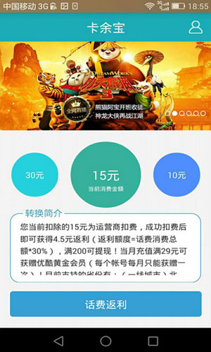 卡余宝app软件特色: 1.卡余宝app专业为用户打造安全可靠的金融理财类手机软件。 2.卡余宝app是款可以用移动话费购买优酷黄金会员的手机理财软件。 3.此外卡余宝app还能解决保底话费用不完、花费报销额度都用不完等问题。