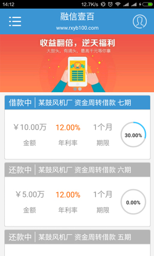 融信壹百网贷之家简介: 1.融信壹百网贷之家,是一家专业从事P2P网络借贷的互联网金融服务平台,致力于利用互联网电子商务的新技术,结合专业、创新的风控手段,为有资金需求和理财愿望的用户打造一个公开、透明、安全、高效的第三方投资借贷信息服务平台。 2.融信壹百网贷之家平台建立了成熟完善的风险控制管理体系,确保平台用户信息的安全(包含借款方与投资方),同时平台上客户的资金由汇潮支付有限公司全程托管,100%保证客户资金安全。