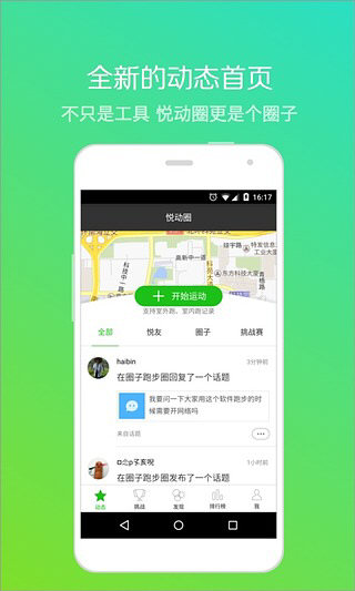 【悦动圈】最火爆的手机运动社区。 悦动圈主要功能 1.跑步领红包——每天跑步或者健走2公里,就可以100%获得现金红包哦! 2.印花挑战赛——团体成员互相鼓励,鞭策,集体跑步拿印花,疯抢运动大红包! 3.百校大战——全国648所高校跑步对抗赛,揭起运动高校风! 4.同城活动——便捷的活动组织管理神器,一键触达,全员定位!跑步运动一键记录! 悦动圈2.3.0版本更新内容 1.圈子支持管理员; 2.支持圈子分享邀请; 3.优化GPS定位丢失问题; 4.修复部分小bug。