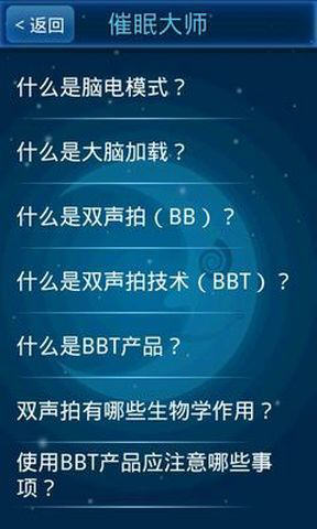 催眠大师软件特点: 1、音乐放松,缓解心理压力。 2、使用BBT技术,直接作用于睡眠中心。 3、不用药物,自然疗法,保证身心健康。 4、专门的私人保健医生。